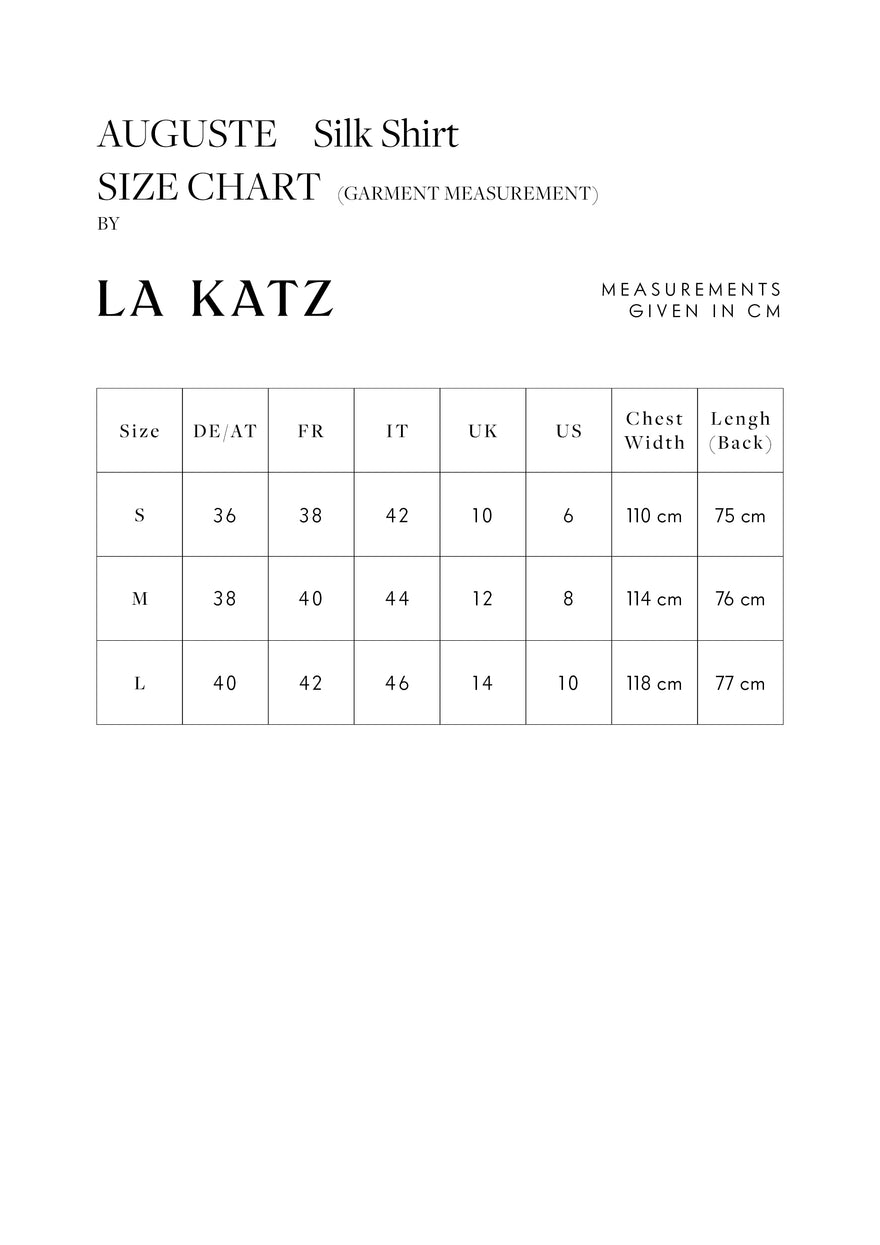 A classic reinterpreted: La Katz's Auguste silk shirt is an essential piece for any luxury wardrobe. Crafted from semi-sheer, luxurious silk georgette in the houses first own leopard print, Auguste drapes easily and fluidly. The oversized style is tailored with a collared neckline and embroidered with eight mother-of-pearl buttons. Pair it with the Josefine pants in the same silk georgette fabric to create the full leopard look and reach the peak of elegance.